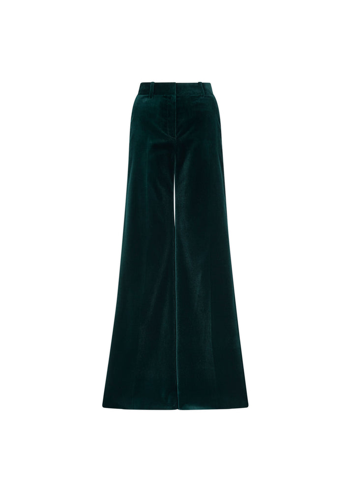 Super luxe wide leg trouser tailored in the finest Italian Velvet. Vertical side pockets and two back jet pockets.