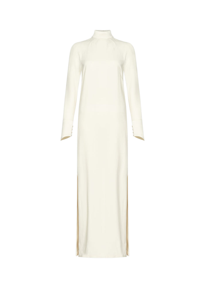 Long, ankle-length dress with collar detail and cuffed sleeves.