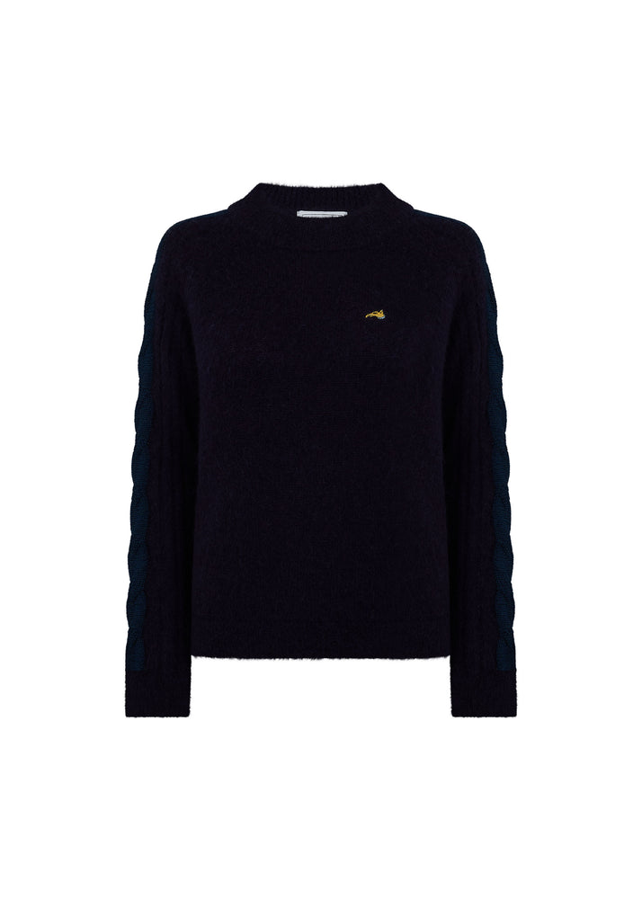 Navy blue cable knit jumper, spun in the finest mohair for comfort and breathability.