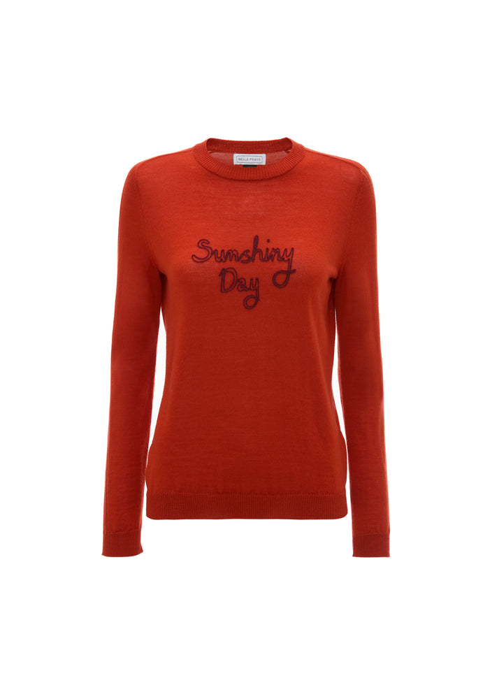 A classic slim fit, the Sunshiny Day jumper features a playful chainstitch artwork, tonally complimented soundly by the lightweight, rust-coloured wool.