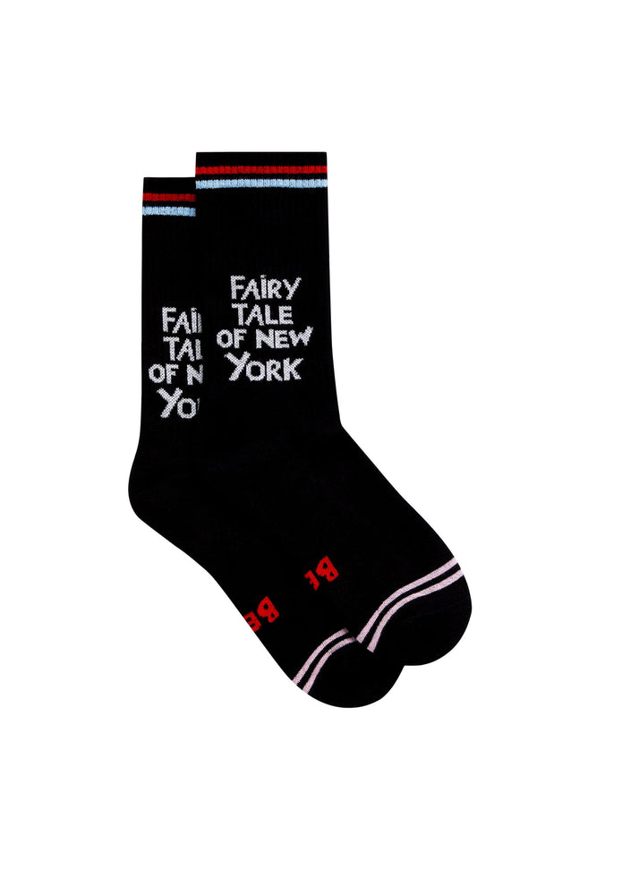 Fairytale of New York Socks in black, with stripe detail and "Bella Freud" Intarsia writing at the bottom.