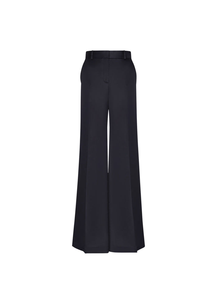 Italian thick heavy weight satin Kim trouser with 70s flare wide leg.