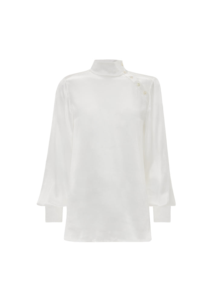 A floaty shirt with a high collar that fastens on a diagonal from the neck to the shoulder. Features a wide box-pleated back and soft puff sleeves in white satin.
