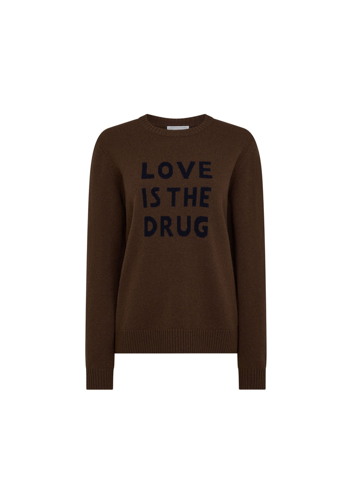 Sky blue fitted wool jumper reading 'Love is the Drug', as illustrated by Bella.