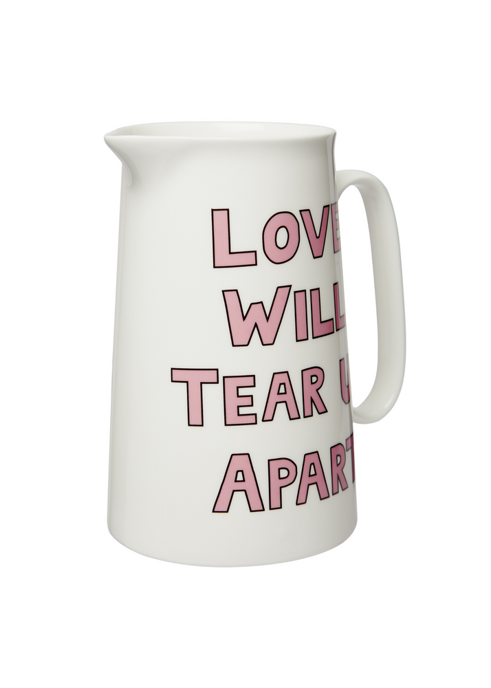 Ceramic jug with Love Will Tear us Apart lettering, originally hand drawn by Bella.