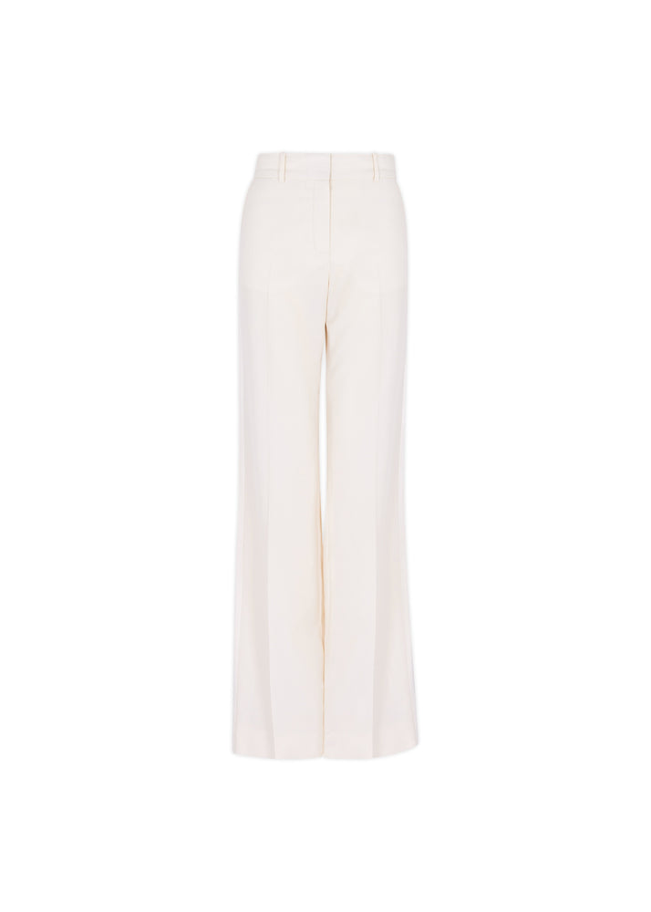 Wool Kim trouser with 70s flare wide leg and satin panels running up each side.